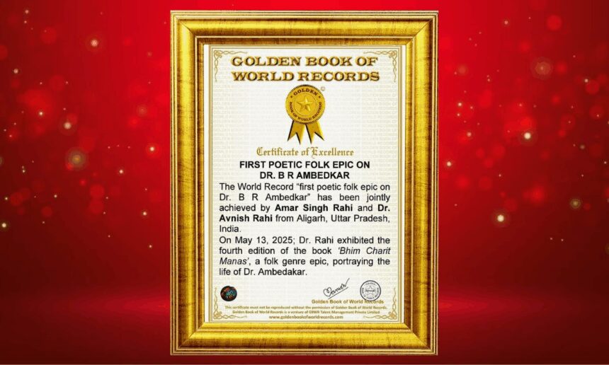 Aligarh, India: Aligarh has once again brought pride to the nation with a remarkable literary achievement. The father-son duo—renowned senior poet Amar Singh Rahi and Bharat Vibhushan lyricist Dr. Avnish Rahi—have authored the grand epic “Bheem Charit Manas”, which has been officially recognized by the Golden Book of World Records.