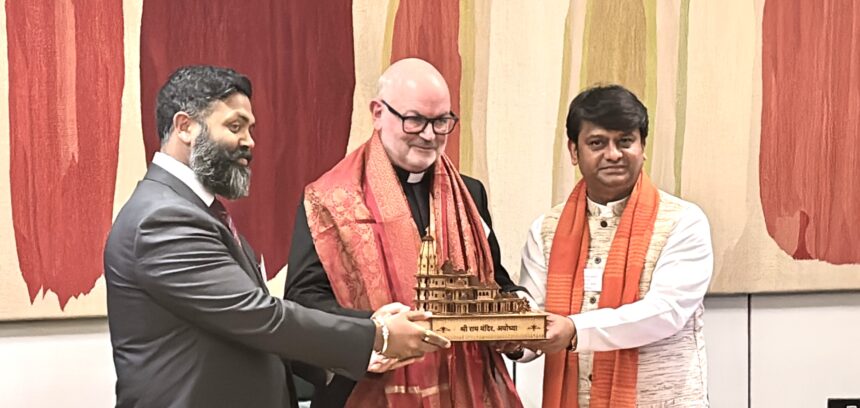 In a symbolic gesture of cultural and spiritual unity, an icon of the sacred Shri Ram Mandir Ayodhya was presented to Rev. Dr Mark Oakley by HH Shri Rajrajeshwar Guruji and Dr. Ishan Shivanand. The ceremony was attended by a diverse audience representing sectors including medicine, education, technology, professional services, and public policy, reinforcing the spirit of shared purpose.