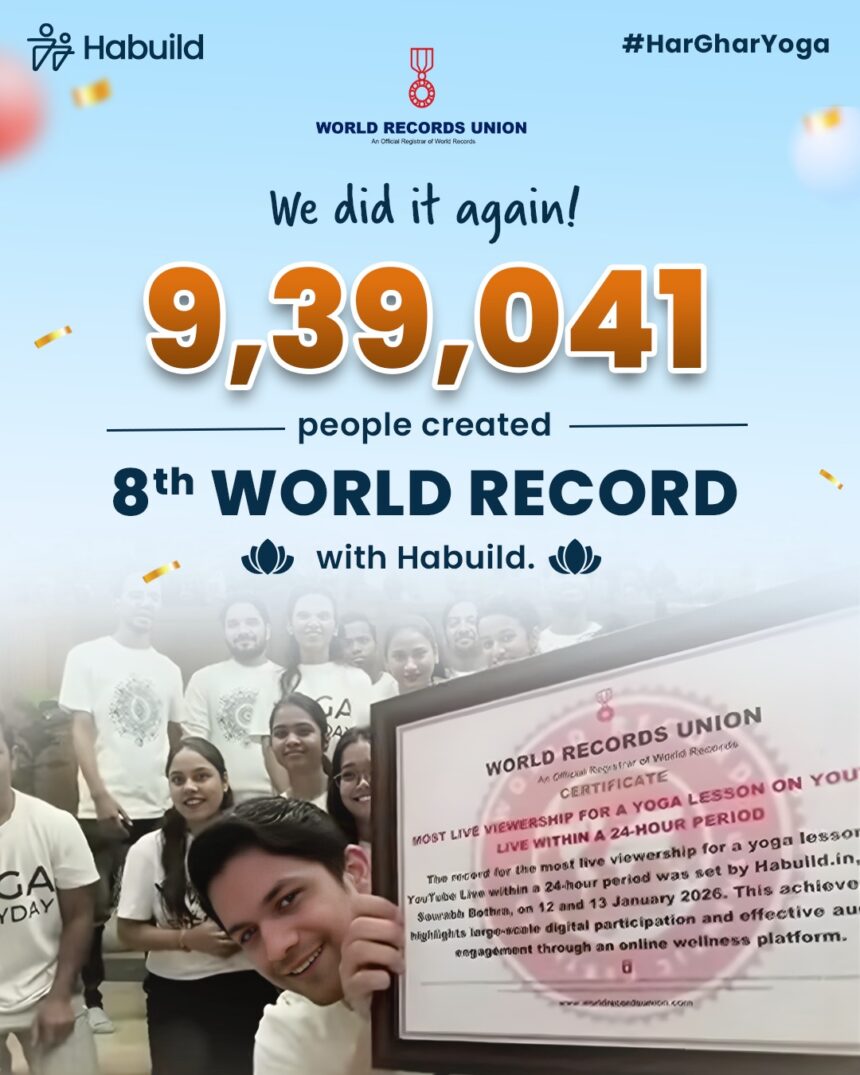 Habuild, India’s first habit building platform, has officially made a world record for the Most Yoga Viewership in a Day, as validated by the World Records Union. The record was achieved through six live online yoga sessions conducted throughout the day, with participation counted cumulatively across all sessions. The initiative witnessed global participation, with 9.3Lakh people joining in. Marking the milestone, the platform also announced the construction of a school, with every new participant’s presence contributing a brick towards the building of the school.