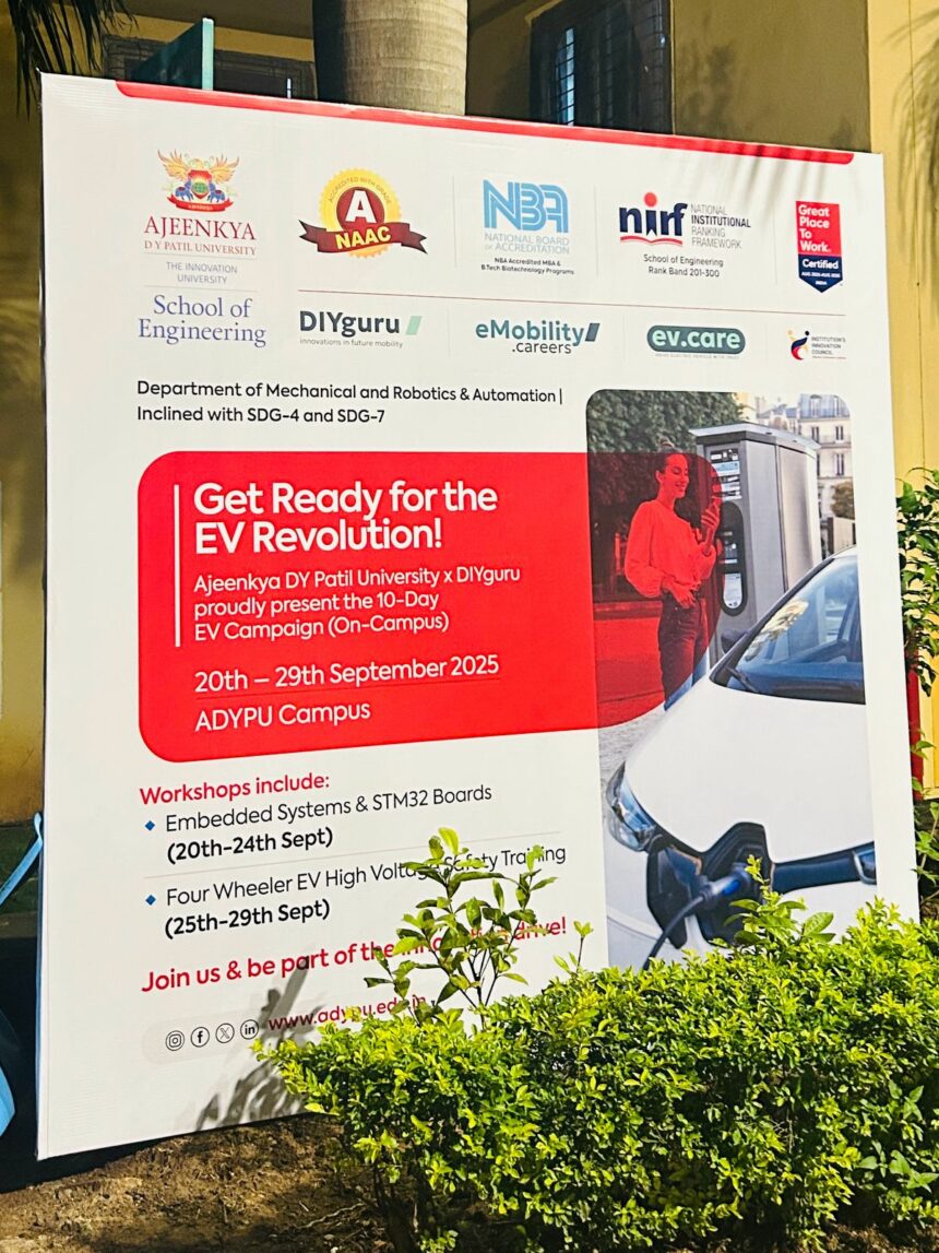 Pune, India – In a landmark moment for India’s e-mobility journey, Ajeenkya DY Patil University (ADYPU) in collaboration with DIYguru is set to host India’s first-ever Four-Wheeler High Voltage EV Safety Training from 25th to 29th September 2025 at its Pune campus. This pioneering initiative forms part of a 10-Day EV Campaign (20th–29th September 2025) designed to build cutting-edge technical capacity in India’s EV workforce.