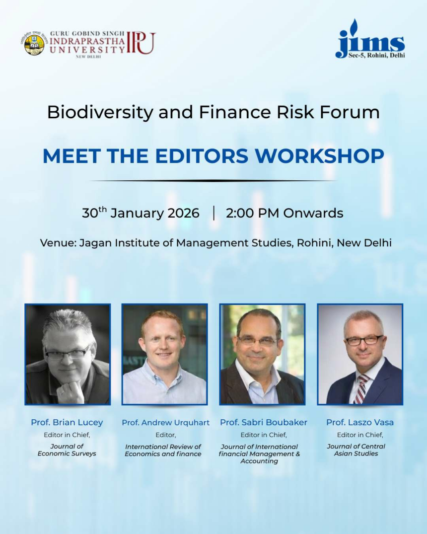 New Delhi, 29 January 2026: Jagan Institute of Management Studies (JIMS) Rohini, in collaboration with Guru Gobind Singh Indraprastha University (GGSIPU), is set to host the distinguished “Meet the Editors” Workshop on 30 January 2026 at 2:00 PM (IST) at its Rohini campus. The workshop is being organized as part of the larger Biodiversity and Finance Risk Forum, an academic initiative aimed at exploring the intersection of sustainability, biodiversity, and financial risk.