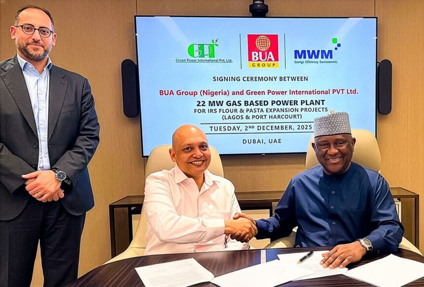 As part of the recently signed deal, Green Power International will install a gas-based power plant at BUA Group’s IRS Flour & Pasta expansion projects in Lagos and Port Harcourt, Nigeria. The agreement was officially signed on December 2, 2025, between Ashu Jain, Executive Director of Green Power International, and Abdul Samad Rabiu, Founder & Executive Chairman of BUA Group, in the presence of Rabih Yazbeck, Regional Director of MWM.
