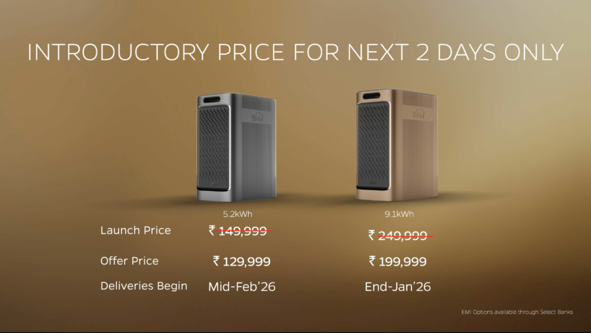 Ola शक्ति is now available to purchase in two configurations: 3kW/5.2kWh priced at ₹1,49,999; and 6kW/9.1kWh priced at ₹2,49,999. The system can power air conditioners, refrigerators, induction cookers, farm pumps, and communication equipment, with fast charging times, and backup capacity of up to 1.5 hours on full load. The product is available for purchase on the Ola Electric website as well as Ola Electric stores, with deliveries for शक्ति 9.kWh starting end of January 2026, and शक्ति 5.2kWh starting mid-February 2026.