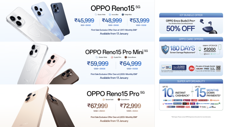 The Reno15 Pro is priced at INR 67,999 for the 12GB + 256GB variant and INR 72,999 for the 12GB + 512GB variant. The Reno15 Pro Mini is available at INR 59,999 for the 12GB + 256GB variant and INR 64,999 for the 12GB + 512GB variant. Meanwhile, the Reno15 is offered in three configurations, 8GB + 256GB at INR 45,999, 12GB + 256GB at INR 48,999, and 12GB + 512GB at INR 53,999. The OPPO Reno15 Series will be available for purchase starting 13th January 2026 with exciting offers on Amazon , Flipkart, Mainline Retail Outlets and OPPO E-store.