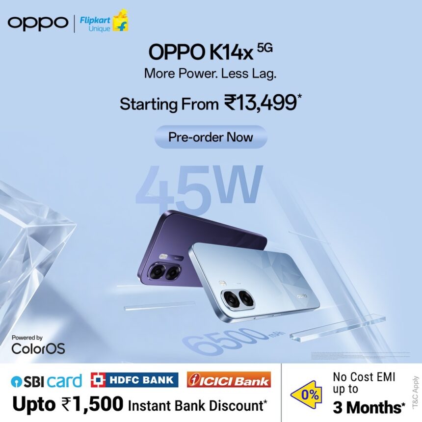 Priced at INR 14,999 for the 4GB+128GB variant and INR 16,999 for the 6GB+128GB variant, the OPPO K14x 5G will be available for purchase starting 16th February 2026 on the OPPO e-store and Flipkart from 12 PM onwards, in two colour options—Icy Blue and Prism Violet. Pre-bookings for the OPPO K14x 5G begin from today, giving consumers an early opportunity to secure the device. Customers purchasing the smartphone can avail a INR 1,500 instant discount on the 4GB and 6GB variants, valid only on the sale day with select bank offers along with an additional 3-month No Cost EMI option, bringing the effective price at INR 13,499 and INR 15,499 respectively.