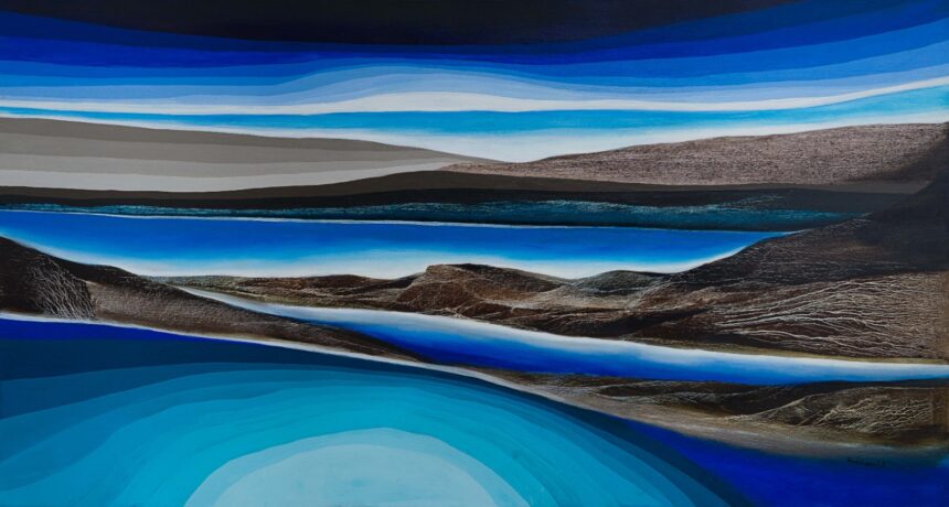 Lot no. 295, Vinod Sharma’s Untitled (2025) is a monumental oil on canvas that presents a serene, abstracted landscape where water, sky, and distant landforms merge into a single, meditative vision. Layers of deep blues, soft greys, and earthy browns flow across the surface, creating a profound sense of depth, calm, and quiet movement, as if the entire scene is mirrored upon a vast, still body of water.