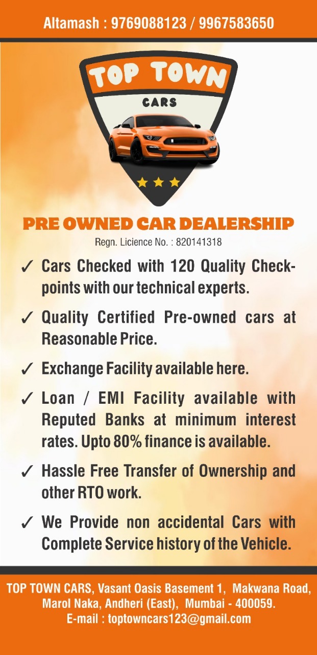 Top Town Cars operates from its base in Andheri East, Mumbai, offering a customer-centric approach that blends convenience and transparency. The dealership has gained a loyal customer base due to its focus on trust and reliability, ensuring that every car meets stringent quality checks before it reaches the buyer.