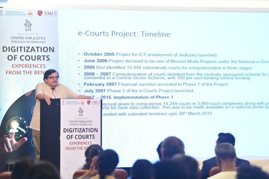 Chennai, November 6, 2023 – Vinayaka Mission’s Law School proudly hosted the 1st lecture of the Center for Justice through Technology (CJT) by Hon’ble Chief Justice Dr. S. Muralidhar, former Chief Justice of Orissa High Court and Judge of the Punjab and Haryana High Court and Delhi High Court. The lecture, centered on “Digitization of Courts – Experiences from the Bench,” took place on Saturday at Chennai. The event saw a distinguished audience of legal luminaries including sitting judges of Madras High Court, senior advocates, students, and technology enthusiasts eager to explore the convergence of law and technology.