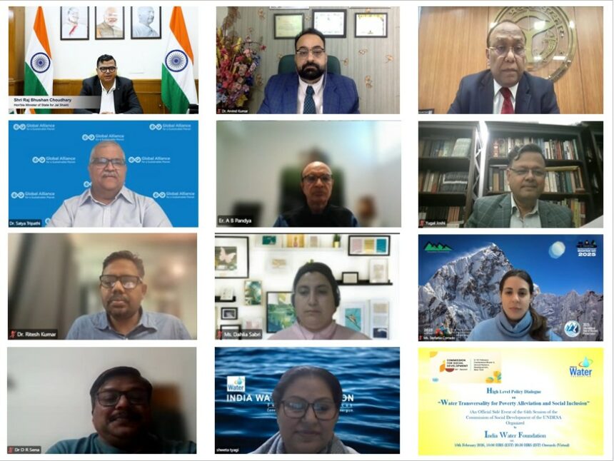 “There is an urgent need to adopt a transversality approach to water governance, one that breaks sectoral silos and embeds water at the centre of planning for poverty reduction, health, agriculture, energy, and climate resilience. Traditional, single-sector strategies are no longer adequate in the face of complex and socio-economic inequalities. Instead, we need integrated policy frameworks that bring government, industry, civil society, and communities together to co-create solutions that benefit both people and the planet” highlighted Sh. Raj Bhushan Chaudhary, Minister of State for Jal Shakti, Government of India, captivating over 500 online participants, experts, and global participants at a high-level policy dialogue on “Water Transversality for Poverty Alleviation and Social Inclusion” organized by the India Water Foundation as an official side event of the 64th Session of the UN Commission on Social Development. The event spotlighted water not as a mere utility, but as a transformative force weaving through health, livelihoods, gender equity, and climate resilience especially in a nation where rural poverty and water stress intersect dramatically. He painted a vivid picture of India’s water revolution under the leadership of Prime Minister Narendra Modi, spotlighting Jal Jeevan Mission’s leap from 60% to over 81% rural tap water coverage, reaching 15 crore homes.